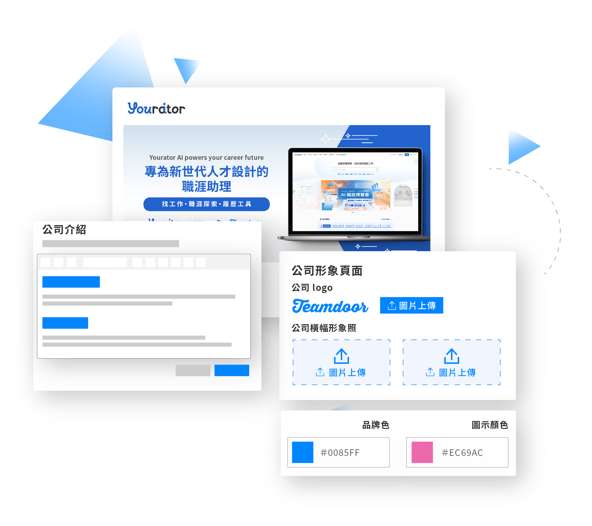 Teamdoor 提供可客製化的徵才頁:自訂配色、橫幅圖片。無需任何程式背景,迅速完成簡約美觀、充分傳達公司文化,且能夠即時更新職缺內容的招募頁面。