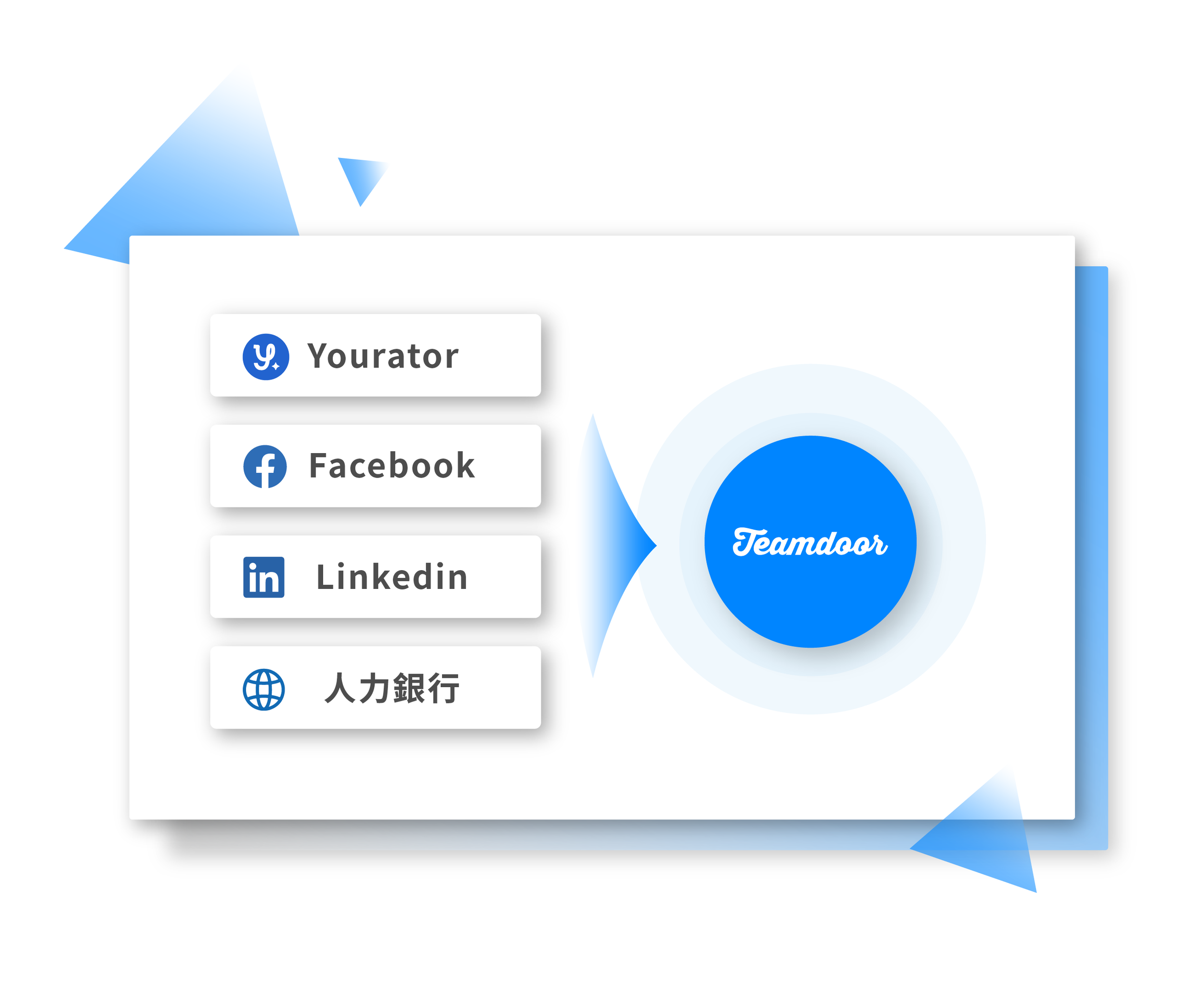 Teamdoor 各管道履歷彙整在一站式後台,包含:人力銀行、社群、Facebook、LinkedIn、獵頭⋯⋯,省下人資維護多個徵才後台心力,並同時追蹤招募成效!