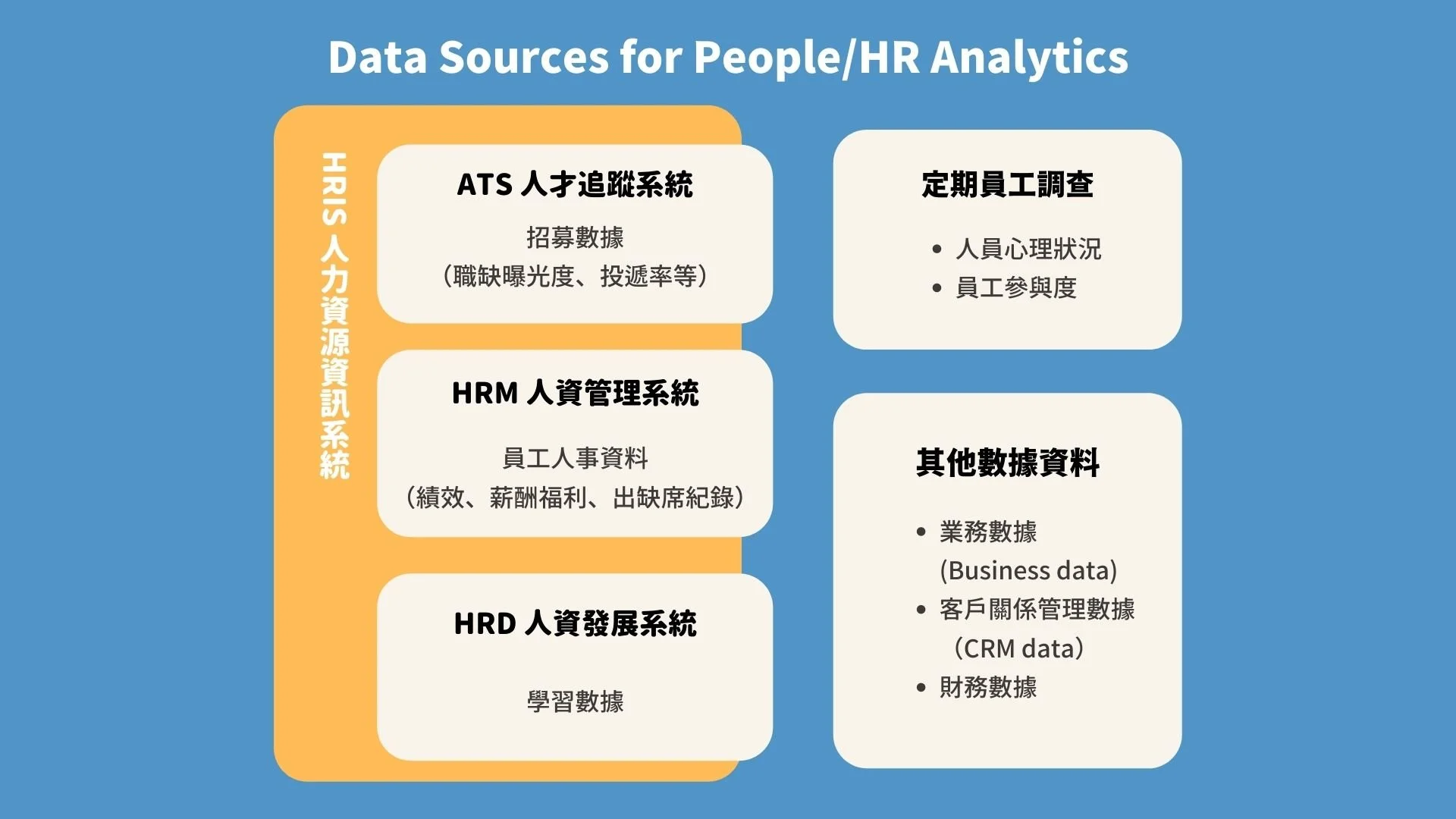 一般而言,人員(人資)分析主要使用數據為透過 HRIS (人力資源資訊系統) 所取得的相關資料。包含利用 ATS 人才追蹤系統取得招募數據;透過 HRM 人力資源管理系統取得員工人事資料(績效、薪酬與福利、出缺席紀錄等);透過 HRD 人力資源發展系統取得學習管理數據。