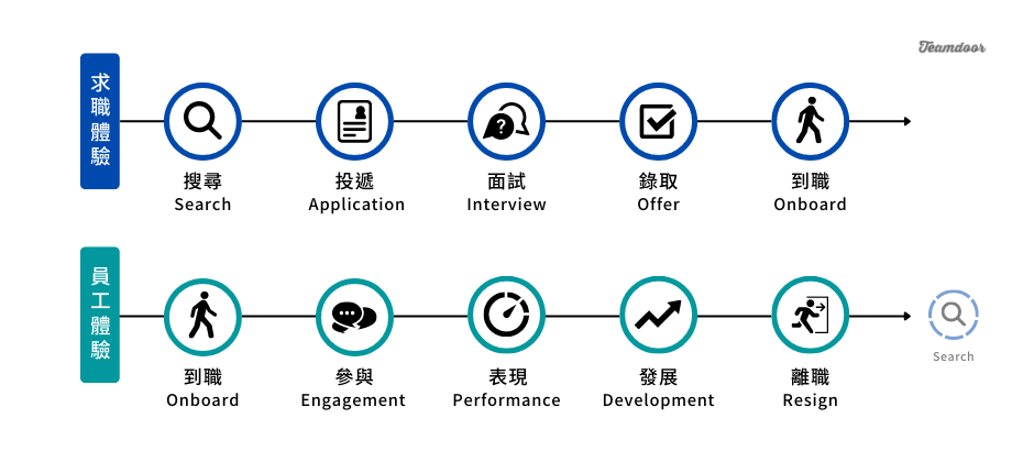 而 員工體驗 (employee experience),則是從員工到職(onboard)後續一系列工作體驗。