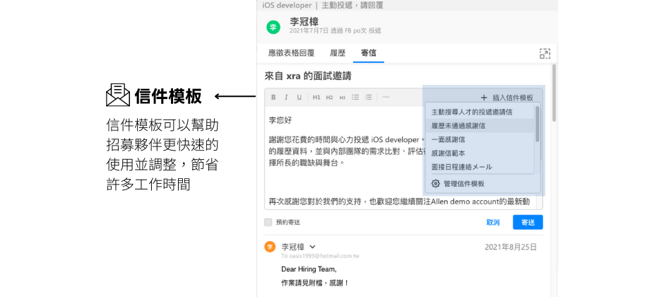1.自訂應徵者表格、通知信系統:為了能在大量履歷中篩選出合適人才,均一在投遞表單上設定許多與 JD 有關的提問,提供求職者選填;為了減少無聲卡的狀況,均一透過 Teamdoor 的通知信系統,客製化通知內容,包含面試、錄取與婉拒信,並且可以排程寄送,避免忙碌人資忘了回覆,也可以讓整體的求職體驗升級。